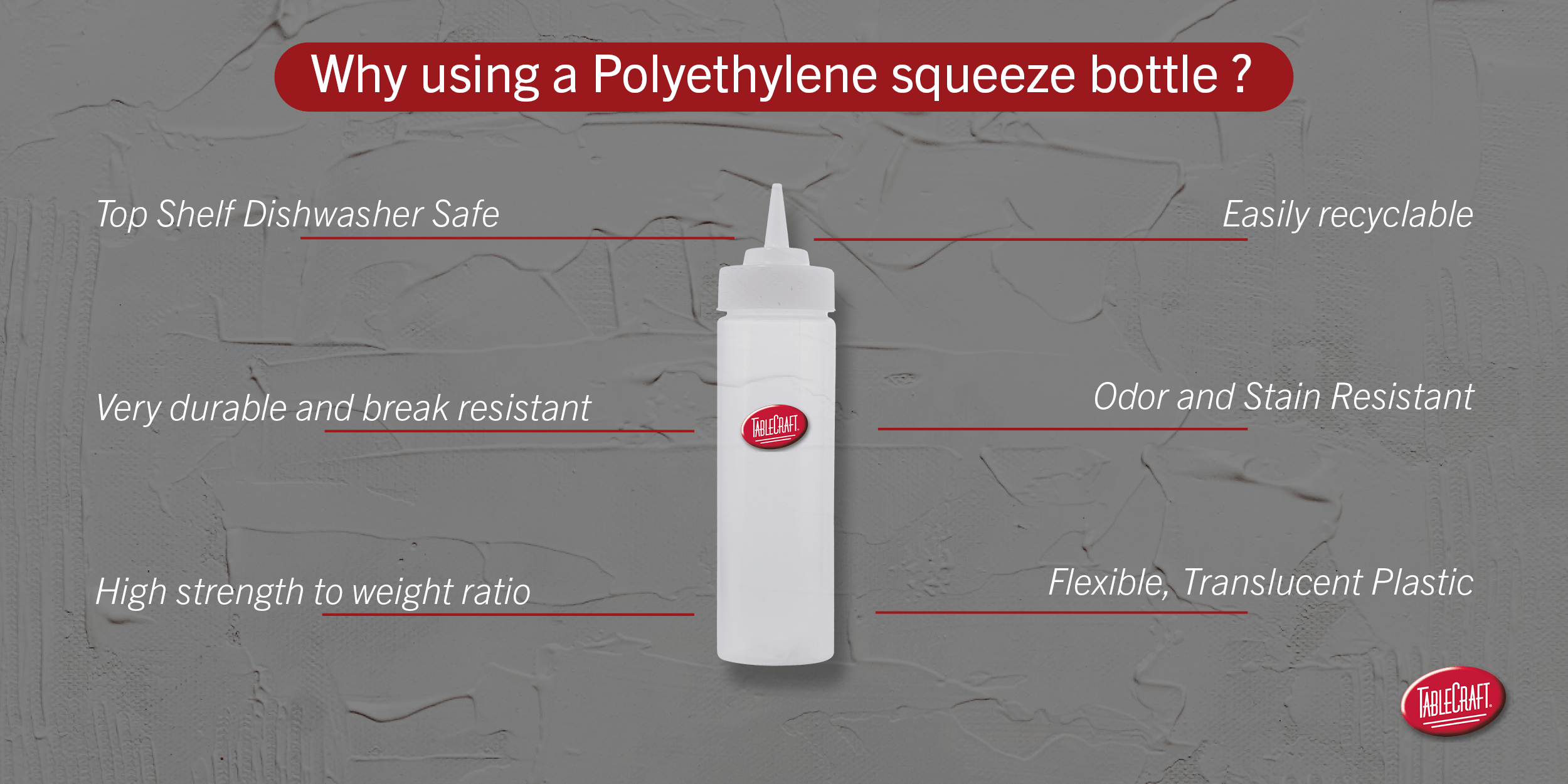 The first step in ensuring squeeze bottles are safe for use in restaurants is selecting the right material. Food-grade plastics, such as high-density polyethylene (HDPE) or low-density polyethylene (LDPE), are commonly used for squeeze bottles. At TableCraft, we use Polyethylene (Low Density – LDPE) which guarantee many advantages for our customers.